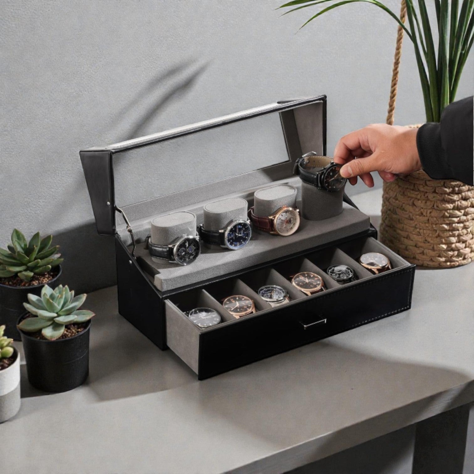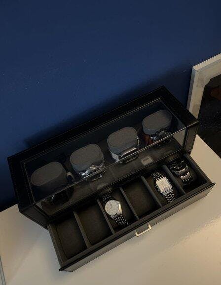 Mit zwei Ebenen, einem eleganten Acryl-Halbdeckel und Platz für bis zu zehn Uhren vereint er Präsentation und Schutz in einem exklusiven Designobjekt. Die samtweichen Innenkissen passen sich mühelos jeder Uhr an und bewahren ihre Form – ob im Alltag oder zur sicheren Aufbewahrung Ihrer besonderen Stücke.